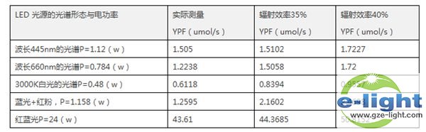 植物灯光谱形态确定后,对应于这种光谱形态的最高YPF或PPF就可以计算出来,这对评估LED植物灯的应用非常重要,也是LED植物灯与其他类型的植物灯性能比较的主要方法,可以参考我们制作的下表: