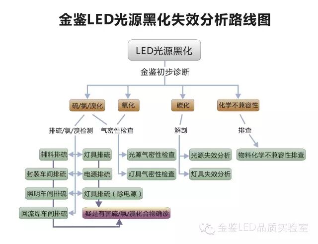 LED支架上的镀银层接触含硫气体会生成硫化银,接触酸性的氯、溴气体则会生成对光敏感的卤化银,这都会导致光源变色失效。光源硫/氯/溴化在LED光源和灯具的生产、存储、老化、使用的每个环节都有可能发生。在光源发黑被确诊为硫/氯/溴化后,客户要根据硫/氯/溴化发生的环节,选择具体的排硫方案。目前金鉴推出的排硫/氯/溴检测项目有:灯具排硫/氯/溴(含内置电源)、灯具排硫/氯/溴(除外置电源)、电源排硫/氯/溴、辅料排硫/氯/溴、封装车间排硫/氯/溴、照明车间排硫/氯/溴、回流焊车间排硫/氯/溴。
