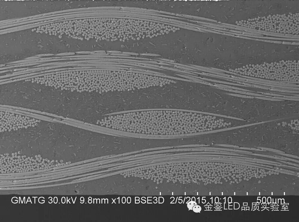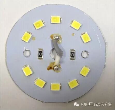 LED的PCB板绝缘层中可能含溴、氯元素,而溴、氯等元素极易与银反应成卤化银,使支架发生变色失效,在有光的环境下,溴化银会分解成黑色银单质,氯化银的颜色会逐渐变深。在这里,金鉴澄清,并不是所有的含溴、氯元素绝缘层都会导致光源出现黑化的现象,但是我们确实遇到两个案例,发现铝基板的绝缘层导致LED光源镀银层溴化发黑。