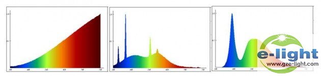 先看以下三张光谱图。(从左到右依次是钨丝灯(白炽灯)、荧光灯、LED灯)
