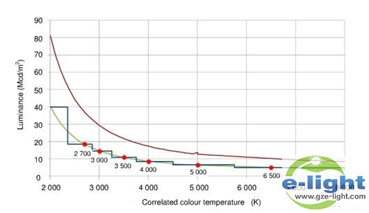 这里有一组IEC推荐的不同色温和光度低风险以下的组合数据。下图分别为不同色温下亮度和不同色温下照度的推荐数据。可以看到,2350K、4000K以及6500K的推荐光度依次为不高于40Mcd/m2、8.5 Mcd/m2、5 Mcd/m2的亮度和4000Lx、850Lx、500Lx的照度。也就是说色温越低,允许的光度越大。