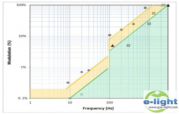 答案是否定的。图4是《IEEE PAR 1789-2015 危险性评估草案LED照明闪烁的潜在健康影响》中对光源频闪对观察者造成危害的分级图,绿色部分为不可察觉区(无危害区),黄色为低风险区,白色为有害区。