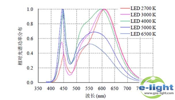 其次,就是通过产品外包装的信息以及产品设计进行大致推断。下图是同等功率的不同色温LED光源的光谱分布,可以看到色温高(颜色偏冷)的LED蓝光成分(大概430nm到490nm这部分)要远远高出色温低的(颜色偏暖)。