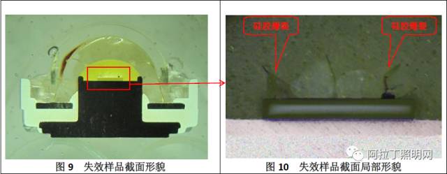 然后,我们又对失效样品进行截面分析,发现芯片正上方的硅胶出现爆裂,如图9和图10所示,其他区域的硅胶完好。