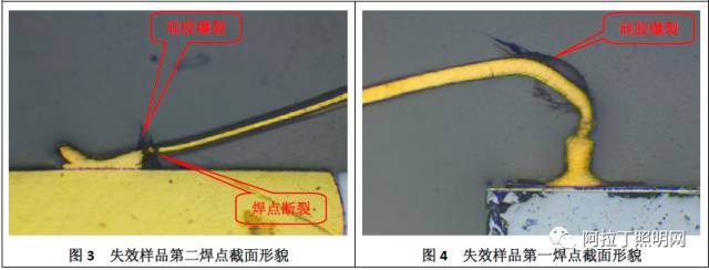 由于硅胶和金线的热膨胀系数差异较大,在经过100循环冷热冲击试验后,硅胶与金线在不断地膨胀又收缩,而金线焊点折弯处就是应力集中点,故最容易造成焊点周围的硅胶爆裂,硅胶的开裂则导致焊线第二焊点最弱处D点断开,最终样品出现死灯。