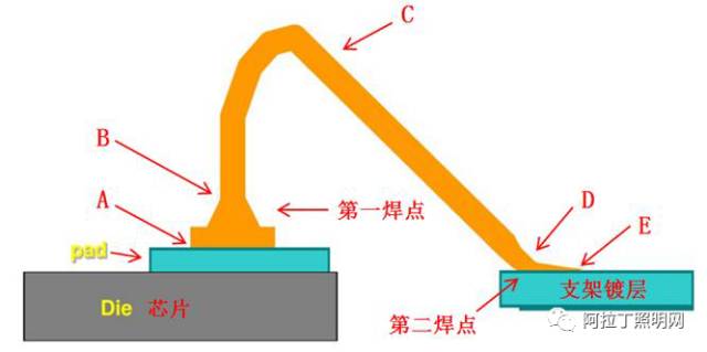 对于“死灯”,首先我们应确定LED是短路还是开路,如果是开路,我们一般会考虑LED灯内部的焊线是否断开。LED灯内部的焊线断开,导致LED没有供电电压,这是LED死灯的常见原因之一。焊线常见的断开位置有5个地方,如图1所示A、B、C、D、E点: