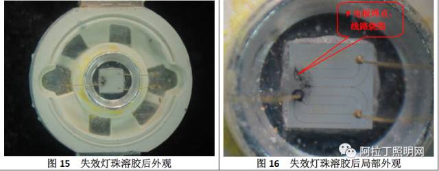失效样品是是仿流明LED灯珠,该LED灯珠使用一段时间后出现死灯。对多个失效灯珠溶胶后进行检查,均发现失效灯珠芯片2个P电极金线焊点和附近的电极图形线路已经烧毁,2个N电极金线焊点、电极图形线路和支架上的4个第二焊点均保持完好,未发现有烧毁或断裂的情况,如下图15和图16所示。