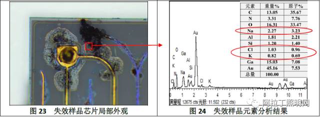 根据元素的化学组成,推测芯片可能受到NaCl和KCl污染。当热与水汽共存时会腐蚀芯片电极,造成芯片电极金属腐蚀及电极线路粘接力下降,甚至导致局部区域脱落。而电极溶解物的迁移会使芯片P、N电极短路导致芯片死灯。