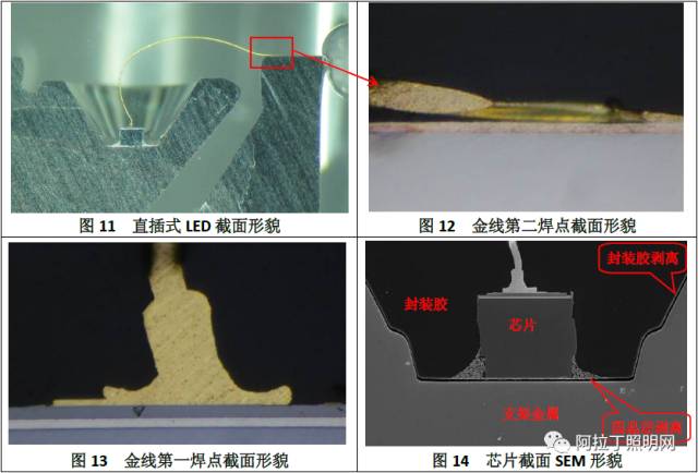 失效样品为直插式的LED灯珠,使用过程中出现死灯,不良率为1.5%。我们对失效样品进行截面检查后发现,金线焊点均保持完好,如图11~图13所示。但发现固晶层与支架镀层完全剥离,而且封装胶与支架杯壁也出现剥离,如图14所示。