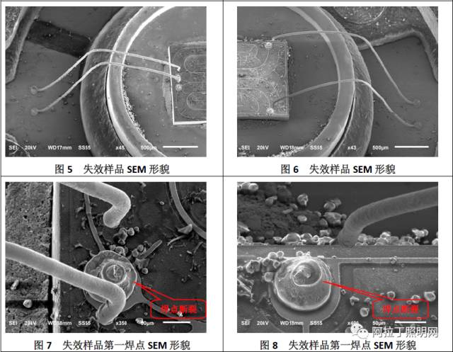 由于出现断裂的4个第一焊点都是集中在芯片上方,保持完好的4个第二焊点是在支架上。说明很可能是芯片上方的硅胶爆裂造成4个第一焊点的断开,而且硅胶爆裂的位置主要集中在芯片,也即是热源的正上方。
