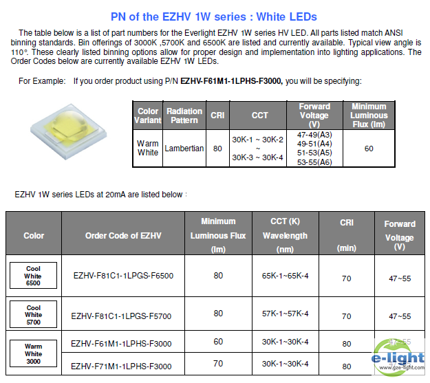 溢光代理台湾亿光原装正品EZHV1W LED Series系列产品