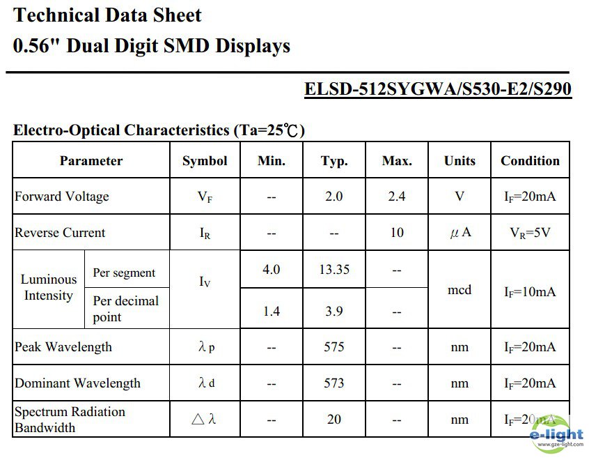 - 产品介绍:台湾亿光一级代理商溢光,销售原装正品 0.56英寸贴片型双八数码管ELSD-512SYGWA/S530-E2/S290。适合室内使用: 音频系统,机顶盒,游戏机,电梯, 电视频道指示器等。欢迎来电选购,咨询电话020-34960421 汤先生